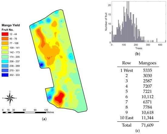 Spatial fruit statistics from the proposed multi-view method: (a) yield map of the orchard block, coloured by the number of fruit per tree; (b) histogram of fruit per tree; and (c) the estimated number of of mangoes for each row and the total. The first three rows have significantly lower yield because of the placement of a shed near the south end. The yield on the other seven similar length rows varies significantly, from 6371 to 11,344. The unproductive block in the southwest corner was removed after these experiments.