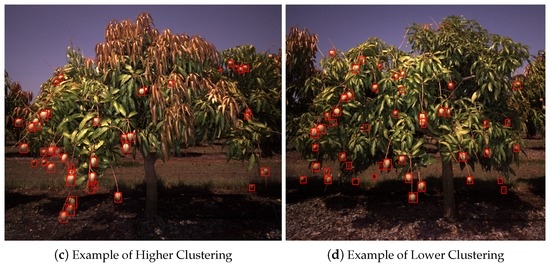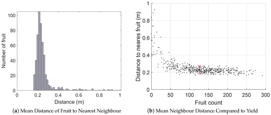 For each fruit, the distance to the next nearest was calculated to indicate the degree of fruit-clustering within the canopies. For example, a low mean nearest-neighbour distance indicates that the fruit are bunched within the canopy, which may impact the quality of the fruit. The results are shown in Figure 15. Figure 15a,b shows that there was significant variability in the neighbour distance, but that this is primarily a function of total yield (for similar sized canopy, more fruit implies tighter spacing). There is also a significant spread above and below the trend-line, due to the variable distribution of the fruit within the canopies. Figure 15c,d shows examples of minimal and maximal fruit clustering for two average yielding trees.