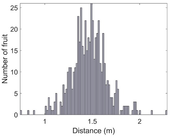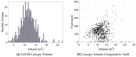 A histogram of canopy volumes calculated from LiDAR is shown in Figure 16, along with the relationship between canopy volume and yield (estimated by the vision system) for every tree. The results show that both the canopy volumes and fruit yields were variable, but that there was no discernible relationship between them. The height of each fruit above the ground is shown in Figure 17. The height distribution is reasonable considering the size and shape of the trees, but no ground-truth was available to quantify the accuracy of the height estimates for individual fruit. The histograms reported in this section were calculated for the entire orchard block, but this system readily permits evaluation at any scale. For example, fruit counts, clustering, heights above ground and canopy volumes can also be evaluated for each individual row or tree, which will be beneficial for defining decision support systems for improved per-tree agronomic management.