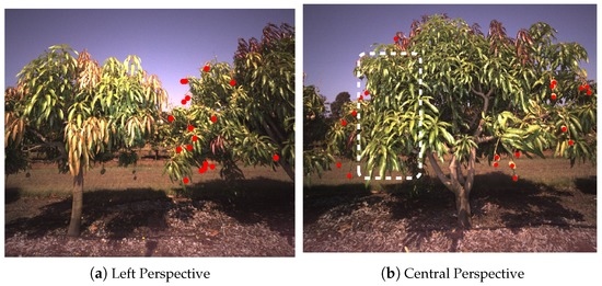Fruit that was detected from the left perspective (a) of a tree is hidden from view in the central perspective (b), due to the occlusion of the foliage in the foreground. Red dots denote detected fruit, and the white rectangle marks the region of the tree where the hidden fruit would be.