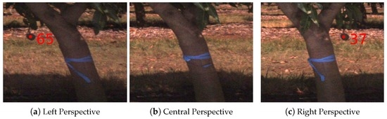 The complete three-dimensional (3D) tree database was then used to create an inventory of which trees were seen in which images from the free-running video camera, as follows. All images for one side of one row were selected according to the entry and exit times. Segmented LiDAR data for that row were voxelised with a resolution of 20 cm and then thinned to 5%, to reduce computation time. The thinned data were geometrically projected into the camera frame [36]. For each image, if a single thinned LiDAR point for a particular tree was present within that frame, then the image was deemed to “contain” that tree. Given the geometries of the camera, platform and orchard, there were either none, one, two or three foreground trees in a single image. Trees in adjacent rows were often visible behind the foreground trees, but these were correctly suppressed in the image contents because the LiDAR data and imagery were processed strictly one row at a time.