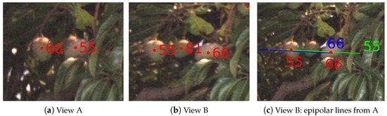 The process of associating fruit between sequential pairs of images is purely geometrical, which means the mapping can become unclear when multiple fruits are bunched together. In Figure 21, an example is given where two nearby mangoes exchanged identifiers during tracking. The distances between the mango centroids and both epipolar lines were similar, as seen in Figure 21c, which led to the incorrect assignment in this case. In this scenario, the total count is not affected, but the incorrect assignment has an impact on the triangulation of the fruit. Triangulation uses the mean intersection of all rays corresponding to a fruit, so the magnitude of the error depends on the ratio of correct to false associations. Outlier rejection could potentially address the error during triangulation; however, a better approach would be to include triangulated depth information during track association. In the current system, a constant minimum and maximum range from the camera constrained the epipolar projections. Once a match occurs between two images, however, the actual range can be estimated separately for each fruit, and this could be used to refine the lengths of subsequent epipolar lines, to reduce the type of ambiguity seen in this case. Existing formulations could be adopted from conventional visual odometry, structure from motion and visual slam techniques to achieve this.