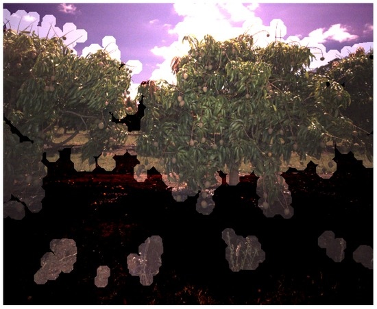 When generating the LiDAR-based image masks, LiDAR points less than 20 cm above the local ground surface were deleted, so that the mask would not allow fallen fruit to be counted. In some cases, tall grass next to the tree, in the foreground of the image, was retained and projected into the camera frame, as seen in Figure 22. By chance, fallen fruit were sometimes detected in these regions and counted for that tree. Examples of fallen fruit can be seen in Figure 13b, as black dots outside of the canopies. Morphological operations could be used on the mask to remove the small disjoint regions seen in Figure 22. Future work will also explicitly tally fallen fruit around the base of each tree, as this may be of interest to growers. This is achievable with a minor extension to the proposed framework, whereby instead of deleting points below 20 cm, they can be retained as an additional layer in the mask. In each image, each detection will be assigned to one of the tree ids or to the ground layer beneath. This will provide an in-canopy and fallen fruit count for every tree.