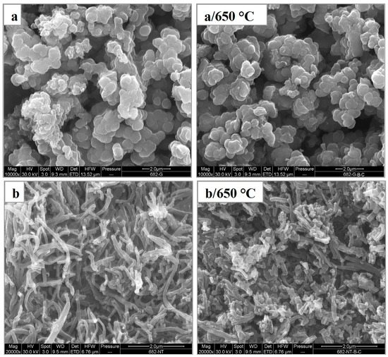 Scanning electron micrographs of (a) original globular polypyrrole and (b) polypyrrole nanotubes. They are depicted before- (left column) and after- carbonization at 650 °C (right column).
