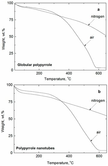 In inert nitrogen atmosphere, however, the residue is in both cases above 50 wt % at 650 °C. Also here, there is no substantial difference in the stability of globular and nanotubular PPy (Figure 3b). This is logical, because the thermal stability is established by molecular, rather than supramolecular, structure.