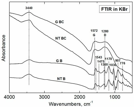 FTIR spectra of original globular (G) and nanotubular (NT) polypyrrole bases before (B) and after (BC) carbonization.