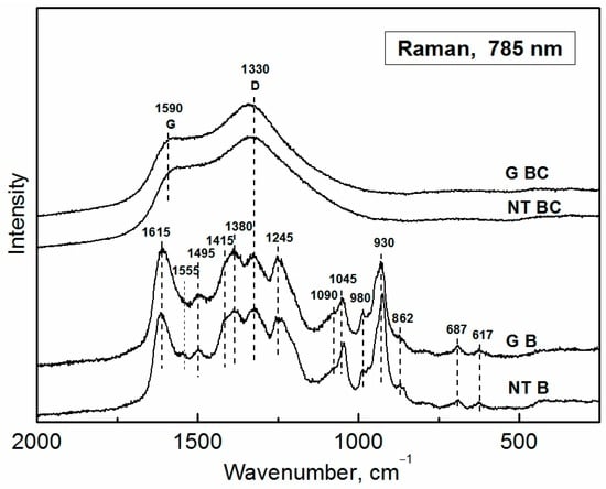 Raman spectra of original globular (G) polypyrrole bases and polypyrrole nanotubes (NT) before (B) and after carbonization (BC).
