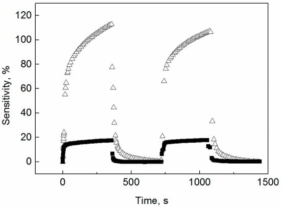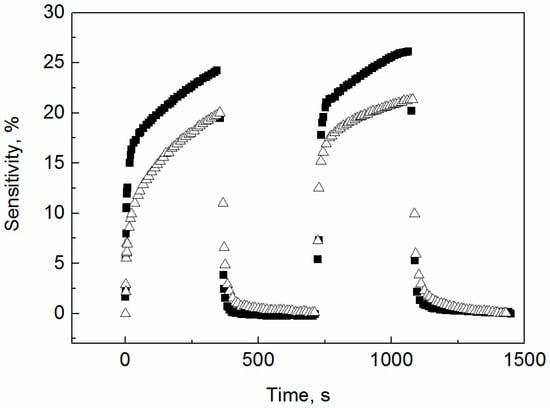 As for alcohol vapors detected on PPy, there are mainly responses reported to vapors saturated at 25 °C (their concentration is in the order of 10,000–100,000 ppm) in dependence on the number of carbon atoms in the alcohol molecule. The sensitivity varies from 0.22% to 37.5% [15,38,40,41,42]. The present result is 18% for 77,000 ppm of ethanol. As for alcohol vapors detected on carbon nanotubes—for saturated methanol vapor there was reported sensitivity from 12.9% to 46.6% [3,5]—one paper presents significantly higher sensitivity, i.e., 429% and 4500% for saturated methanol vapor [4], while the result of this study is 24% for 77,000 ppm of ethanol.
