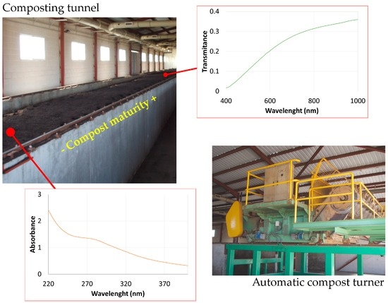 The compost samples collected at different locations within the composting tunnel exhibited different spectral patterns and chemical fractioning. Figure 1 shows an overview of the composting tunnel and a detailed image of the system employed for the aeration and mixture of the compost. We include an example of a characteristic absorbance UV spectrum obtained for samples located at the beginning of the composting process (14 days of maturity). A characteristic transmittance VNIR spectrum for a higher degree of compost maturity (49 days of maturity) was included as well. Both characteristic spectra do not exhibit relevant absorption or reflection bands that could be enhanced with a derivative analysis.