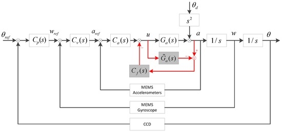 The acceleration feedback control (AFC) is a kind of high-precision robust control method to form multi-loop feedback control (MFC), which has been widely used in some high precision systems such as telescopes, missiles and robots [11,12,13]. In FSM systems, the acceleration closed loop can improve the stiffness of the system. In previous works, some researchers focused on how to design the acceleration controller because of the quadratic differential in the FSM transfer model. To avoid the saturation of double integration, Tang designed the controller as a band-pass filter and combined a CCD and accelerometers to implement dual closed-loop control [14]. Tian used a CCD, gyroscopes and accelerometers to implement a three-closed-loop control model, and a lag controller was used to accomplish acceleration control, which improved the disturbance suppression performance powerfully [9,15]. But the error rejection ability of the FSM system is still not adequate when suffering some uncertain disturbances, because of the mechanical resonances, CCD time delay and the drift noise in MEMS inertial sensors [14].