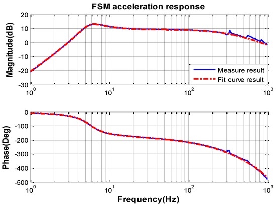 Because of the high bandwidth of the MEMS accelerometer KXR94-2050 (Kionix, New York, NY, USA) [24], the frequency characteristic can be measured to 1000 Hz. By the curve-fitting method and transfer function identification, the mathematic transfer function model of the FSM acceleration response can be obtained as follows: