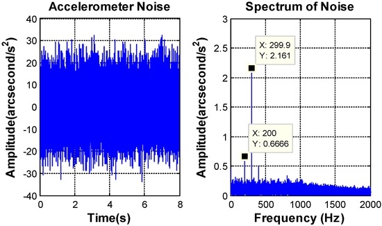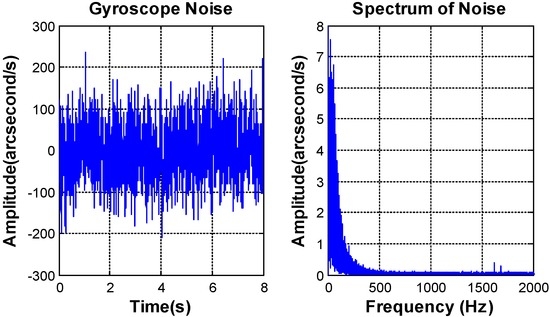 The bandwidth of the MEMS gyroscope SCR1100-D02 (Murata Manufacturing, Nagaokakyo, Kyoto) [25] is less than 100 Hz. The noise mainly focuses on the frequencies ranging from 0 to 200 Hz. The peak value of the MEMS gyroscope noise is equal to 0.069°/s2, and the RMS value is about 0.016°/s2, which satisfy the requirement of the control system.