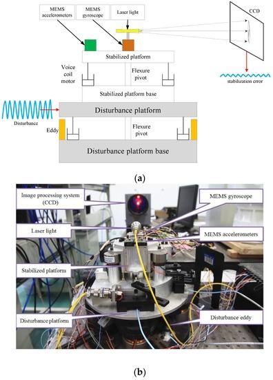 As shown in Figure 9a, an apparatus constructed by two superimposed FSM systems is used to test and verify the previous analysis. One is used to stabilize the LOS; the other is used to simulate disturbance. The stabilized platform is mounted on the disturbance platform and the laser light is fastened on the top of stabilized platform directly as a reference of LOS. Both of the platforms are driven by the voice coil motors. The eddy sensors in the disturbance platform are used to measure the disturbance input of the stabilized platform and the CCD is used to obtain the stabilization error. Four MEMS linear accelerometers and one MEMS gyroscope are set on the stabilized platform to measure the angular acceleration and angular velocity, respectively. In the experiment, all of the MEMS inertial sensors and the disturbance eddies are at 5000 Hz sampling frequency, moreover, the CCD has only 100 Hz working frequency and 20 ms (two frames) time delay in addition.