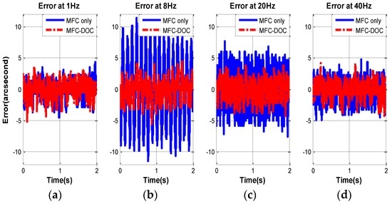 The disturbance suppression of FSM system is measured when the stabilized platform control is closed and the disturbance platform is opened. Then, four experiments in different frequency disturbance are compared as follows, and the error of MFC and MFC-DOC are given in Figure 10 and Table 1.