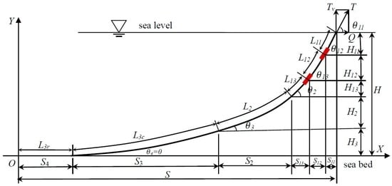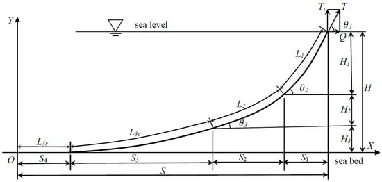 The mooring line is connected with the floating platform through the fairlead, and expends in water to the seabed. The end touching point between the mooring line and seabed is marked as the coordinate origin (Point ‘O’ in Figure 1). The seabed is assumed to be planar, and marked as the X-axis. The Y-axis is perpendicular to the X-axis, and represents the water depth direction.
