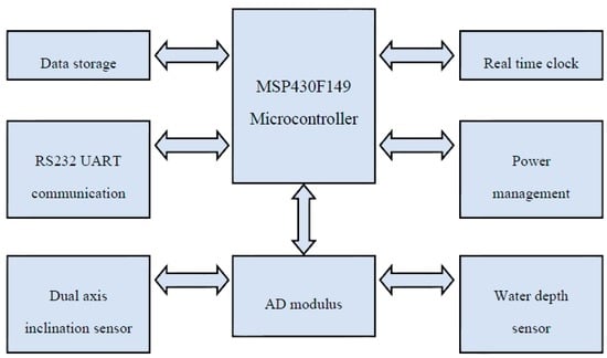In order to collect the full range of mechanical response of the mooring system, the sampling frequency of the sensor, including water depth and inclination, must be adjusted from 1 to 10 Hz. Self-contained sensors are installed on the underwater mooring chains, and the requirements of the sensors being miniaturized and waterproof must be satisfied. The most suitable installation mode must also be considered. Figure 3 presents the system block diagram of the self-contained D-I sensors. The microprocessor, clock modules, water pressure and inclination modules, A/D transform, storage and power management are described in detail as follows: