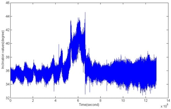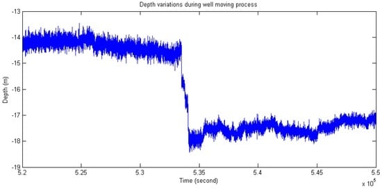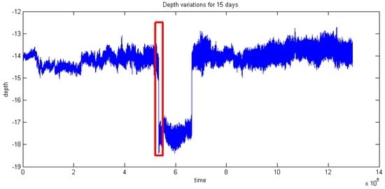Figure 13 and Figure 14 illustrate the inclination angle and water depth distribution in the time domain within 14 days. In order to test the abilities of the present sensor in adapting to the changes of water depth and inclination, an adjustment process of the mooring line was carried out during the monitoring period. It could be observed that there were two sudden changes in Figure 13 and Figure 14. Figure 15 presents the partial enlarged image of the water depth profile at the rectangle range, marked with red in Figure 14.