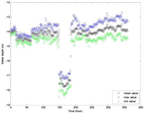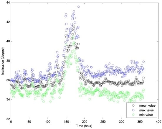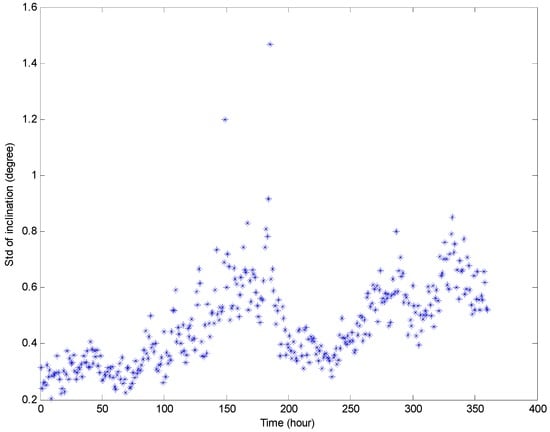 Figure 16 and Figure 17 show the maximum and minimum values of the water depth and inclination within each hour, respectively. The variation range of the inclination is about two to five degrees, and the variation range of the water depth within each hour is about 0.5–1.5 m in an ordinary operation condition state (except for the mooring adjustment process). Figure 18 and Figure 19 show the standard deviation distributions of the water depth and inclination within each hour. It could be observed that the standard deviation values of water depths are more consistent than those of the inclinations, except in the well moving process.