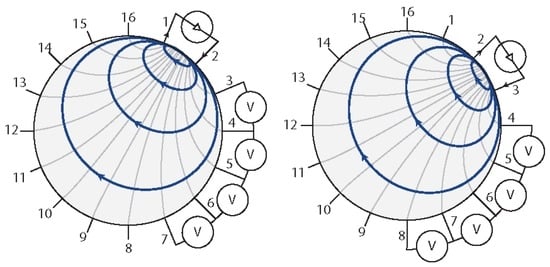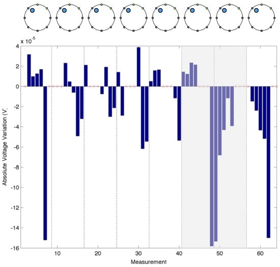 It is possible to classify the most-used patterns according to the number of current sources that are used in the injection part: bipolar patterns [] use only one source, while optimal patterns [,] use multiple independent sources. The classification can be further refined by considering the relative position of the electrodes or the relationship between the electrical currents that are injected. Despite their name, optimal patterns are not the most-used ones. In fact, such patterns require a careful pre-tuning of the system, since the injected current cannot be obtained analytically. In addition, they are less tolerant to noise, to the electrode position and their contact impedance, and to the correct modelling of the forward problem. These patterns have the potential to produce more accurate images than the ones returned by the bipolar pattern. Bipolar patterns, on the contrary, are less prone to modelling error; thus, it is possible to use them in different situations. This peculiar property—in addition to the hardware simplification brought by the use of a single current source—makes bipolar patters the most used for EIT applications. Among these, adjacent [] patterns are the most popular and easy to implement. These patterns use a pair of adjoining electrodes, both in the current injection and for the electric potential measurements. An example of a typical measurement sequence is depicted in Figure 1.