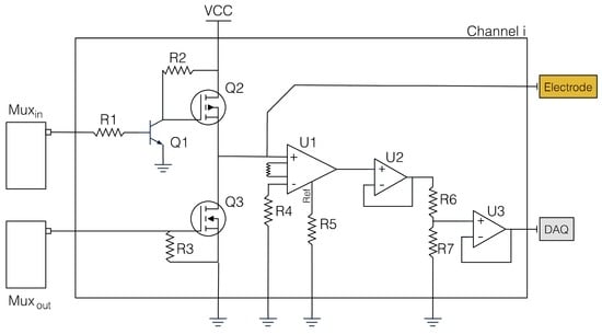 Schematic overview of the driving and readout electronics. The image depicts the configuration for a generic channel and its components. By using this configuration, a single channel can be set as: (i) current source; (ii) current sink (ground electrode); or (iii) used to measure the electric potentials with respect to an external common ground. The process is controlled by the two independent de-multiplexers connected at each channel. DAQ: data acquisition board. In the figure, Q1 is the NPN transistor, Q2 and Q3 respectively the P-MOSFET and N-MOSTEF, U1 is the INA118, U2 is the OPA827, and U3 is the TLV2371.