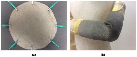 To exploit EIT as a tomographic technique, it is fundamental that the media over which the measurements are taken is conductive—best results are achieved when the conductivity is homogenous over the whole domain. In order to let our sensor achieve flexibility and adaptivity to various geometries, we used a highly conductive medical grade textile (Statex, Shieldex MedTex180) as sensing material. The material changes its conductivity non-linearly when stretched along any of the two directions. The conductive layer was firmly attached to a thin, stretchable foam substrate. This sightly limits the stretchability of the whole sensor, but allows the conversion of normal forces (i.e., vertical forces, such as touch) into noticeable local in-plane deformations. An additional benefit inherited from the use of the substrate consists of the possibility of applying the artificial skin over different materials while maintaining its insulation from the injected electrical current. The sensing area of the artificial skin has a circular shape, with a diameter of 200 mm. Figure 3 shows an overview of the artificial skin in two different application scenarios.