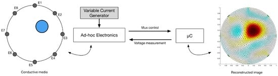 Initial tests for the reconstruction process were performed using an open-source Matlab toolbox—Electrical Impedance Tomography and Diffuse Optical Tomography Reconstruction Software (EIDORS []). In order to provide more direct control of the parameters of the inverse solver algorithm, and to interface it with the acquisition system, we designed and implemented a modified version of the Matlab toolbox.
