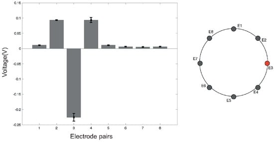 Electric potentials measured at Electrode 3 (E3) in an eight-channel configuration. Measurements were taken using an adjacent pattern, in both excitation and acquisition phases. The positive peaks correspond when the electrode is “close” to ground nodes. On the contrary, the negative peak occurs when E3 is used as a current sink. Error bars show the variability of measurements calculated over 10 samples.