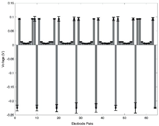 Electric potentials measured at each electrode pair by using an adjacent pattern in both excitation and acquisition phases. The measurements were taken when no load was applied over the artificial skin.