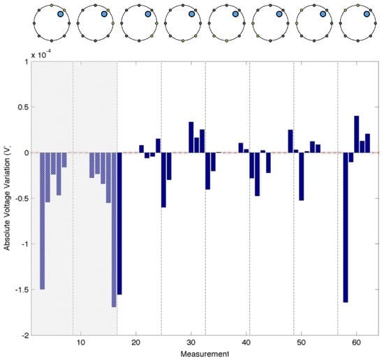 Using the same electrode configuration as in the previous experiments, we evaluate the changes in the acquired electric potentials as a consequence of an applied load over the sensing area. To better notice the phenomena, we chose the position of the probe as 5–10 mm apart from the electrode under test. For this specific test, we used only one probe with a circular section (15 mm radius), over which we applied a constant force of 3 N. By simply comparing the measurements in the presence and absence of the applied load, it is not possible to clearly appreciate the difference between them. A more clear understanding is noticeable by considering the absolute variation () between the two measurements. Figure 8 shows the absolute difference using the value acquired by Electrode 2 (E2) when the probe was paced in the region facing the electrode. In the figure, the different measurements are grouped according to the electrode acting as ground. Each bar represents a voltage difference computed over the adjacent electrode; e.g., the first bar refers to electrodes E1–E2, the second to E2–E3, and so on, until all the electrode pairs are considered. Shaded regions are not to be considered since the electrode under consideration was acting as current source or connected to ground. In the figure, major negative changes occur in the electrode pairs that involve E2 (i.e., the first three bars in each group). The changes are a consequence of the presence of the probe that, acting on the conductive surface, changes the local conductivity of the layer. It is possible to notice a similar pattern when any of the other electrodes are considered. As reference, Figure 9 shows the absolute electric potential when a load was acting in the region facing Electrode 7 (E7).
