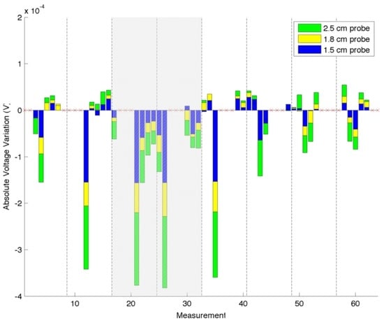 Considering the same electrode configuration, we evaluate the changes in the absolute voltage variation as a function of the probe size, while applying a constant force (5 N) over them. Three different circular probes with radius of 15 mm, 18 mm and 25 mm were placed independently in front of the region facing Electrode 4 (E4). Figure 10 shows the results of the experiments. As the graph suggests, with the increase of the probe size, the variations of the electric potential increase. This was expected, since a larger probe generates a wider inhomogeneity area, which is the cause of a consequent voltage drop. Even if the probe size is changed, it is still possible to notice a large negative change in the electric potentials when E4 is considered in the measure. Similar effects are expected in the case where the probe area remains constant and the applied force is increased. This consideration requires additional verification, which is left as future work.
