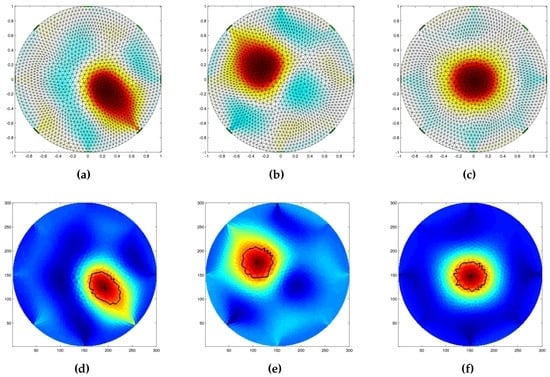 Once a full cycle of measurements has been performed, the electric potentials are then processed by an inverse problem solver algorithm to reconstruct the internal structure of the studied domain. An initial practical method used for this purpose was a non-iterative linear method known as back-projection []. The method is fast and is commonly used in various tomographic imaging techniques, such as X-ray scans. By the use of this approach, the equipotential volume between a pair of electrodes is back-projected along the whole boundary of the body. By combining all the projections, it is possible to estimate the position of the different conductive regions within the domain. While back-projection is conceptually simple, it does not correctly solve the EIT problem, since the current does not move in a straight line (i.e., differently from X-rays), but floods a region from source to drain. An example is given by the iso-potential lines shown in Figure 1. As a consequence, the reconstructed image results are blurred with some clear artefacts. In addition, when higher dimensions than 2D are considered, the technique suffers from additional limitations. For this reason, different novel approaches have been implemented. These consist of the use of deterministic algorithms based on the computation of the Jacobian—the linearised mapping between the boundary electric potential and the internal conductivity—of the discrete forward solution. The use of such algorithms allows for more precise solutions, even for higher-dimensional domains. Two practical approaches to reconstructing the inhomogeneity map are: (i) using static imaging; (ii) or using dynamic imaging. In static imaging, the absolute value of the conductivity distribution is reconstructed using an iterative approach. This method is extremely sensitive to uncertainty in electrode position, and it is generally slow, since at every step of the iteration, the FEM model has to be updated with the acquired measured data. The dynamic imaging approach, on the contrary, uses non-iterative one-step algorithms to reconstruct the differences in the conductivities between the two time frames. This is done by comparing a reference measurement—where homogeneous conductivity all over the domain is assumed—with later ones. Since the comparison is performed only on the changes in electric potentials, the method is fast, and it allows possible problems due to unknown contact impedance between electrodes and the measured media or problems related to incorrect positioning of the electrodes to be overcome. In both approaches, it is common practice to pre-condition the system using a regularisation method. This allows movement from an ill-posed problem to a similar well-posed one by attenuating the distribution of the null values in the matrices that are the cause of numerical instability.