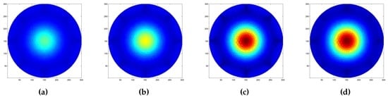Reconstructed image as a function of different probes applied at the centre of the artificial skin. The results provided are, respectively, for: (a) a circular probe with 15 mm radius; (b) a circular probe with 18 mm radius; (c) a circular probe with 25 mm radius; and (d) a square probe with with a 15 mm side. Due to the low resolution of the system, it was not possible to clearly discriminate between the different shapes. Nevertheless, the change in the probe size can be easily identified.