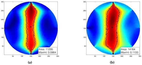 As an initial test, we placed the artificial skin over a flat surface and then took a series of electric potential measurements. With those values stored as reference, we placed the artificial skin over different cylindrical objects—two polyethylene foam extruded cylinders—with radii, respectively, of 40 mm and 70 mm. The two cylinders were then placed over a flat surface in order to provide sufficient support, and avoid their bending. Due to the presence of the foam substrate and the small size of the underlying object, the artificial skin could not conform perfectly to it. Thus, in order to fully cover the cylindrical object, we ket the two free sides of the artificial skin together by means of a plastic strip. In this configuration, we performed the electric potential measurements. Figure 14a,b shows, respectively, the results for the two different cylinders. The reconstructed conductivity maps presented in the two figures show a different behaviour compared to the one seen in the the previous experiments. In fact, instead of having a ellipsoidal region, this type of deformation produces a more elongated one. By comparing the images in Figure 14, it is possible to notice a slight change both in the maximum value detected and in the computed deformation area, obtained as in the previous cases by thresholding the reconstructed map. These observations can can be used as a clue to discriminate between different types of deformations applied to the artificial skin.