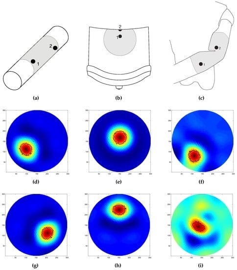 We further tested the capabilities of the artificial skin by evaluating its ability to adapt to different geometries while maintaining its sensing performance. Figure 14 and Figure 15 show the results related to this last series of experiments. In the first phase, we tested the system’s ability to detect a change in the underlying geometry caused by a significant change in the potential measurements (Figure 14). We first acquired a series of electric potentials with the artificial skin placed over a flat surface, and then manually placed it over a curved one. As curved surfaces, we used two different cylindrical objects with radii 40 mm and 70 mm, respectively. As the results indicate, when compared to the reconstructed images from the flat cases, the reconstructed images show a different “shape”. These results, together with the fact that the maximum detected value and the size of the “deformation area” increased with respect to the radius of the underlaying cylinder, can be used as a clue to discriminate between different events (i.e., bending vs. touch) and their intensity (e.g., bending angles). Additionally, we tested the sensing capabilities of the system to provide reliable pressure readings when subjected to large deformations. In order to prove this, we tightly attached the artificial skin to objects having different shapes, and then performed pressure sensing. Contrary to the precious case, we acquired both the reference measurements and the later ones when the artificial skin was already placed over each object. Doing so, all of the deformations that occur as a consequence of the underlying geometries are negligible, since they are already taken into consideration in the reference measurements. Figure 15 shows the results for each of the considered scenarios. As the results suggest, the system maintains its sensing capabilities and can identify the position where the probe was applied. Some issues were noticed when the sensor was applied over the mannequin, especially in the joint area. If the joint is moved after acquiring the initial reference measurements (Figure 15i), the measurements acquired later are affected by a planar force applied by the joint—i.e., the joint stretching the material. The sensor can be still used in this situation by taking new reference measurements according to the information provided by the joint encoder. For all the other cases, results remain valid, even when the probe was applied over the most bended area (Figure 15g,h).