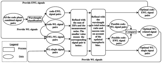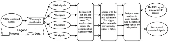 GF TCAR can eliminate most of the effect of the error sources, such as the satellite orbit error and the tropospheric bias, by adopting a pair of combined signals in each step. Taking advantage of the triple-frequency signals, the optimal combined EWL and WL signals can significantly enhance the efficiency and reliability of the AR [33,34]. However, many researchers proposed combined signals often only considered the EWL or WL signal independently instead of the signal pair [12,16,21]. Therefore, the main aim of this subsection is to discover the optimal combined signal pair in theory to fix the ambiguities more easily, mainly considering the following four criteria, wavelength, the sum of ISFs and the measurement noise, the wavelength to total noise ratio and the theoretical success rate. Figure 1 summarizes the procedure of selecting the optimal signal pairs for GF TCAR using these four criteria.