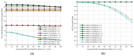 The variation trend of AR success rate in GB TCAR. (a) The success rates of all the selected combined signals; (b) The reliable ratio of WL(1, −1, 0) compared to EWL(1, −6, 5).