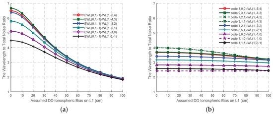 With regards to the former four criteria, the next mission is to determine the most useful signal pair out of the three fundamental carrier phases and the three original codes for the GF TCAR purpose. The combined signal pairs containing the combined code signal and EWL phase signal are firstly selected as shown in Table 1. Only four EWL phase signals meet the criteria discussed before, while only two of them, EWL(0, 1, −1) and EWL(1, −6, 5) are linear independent. The wavelength to total noise ratio and the AR success rate of all these signal pairs are analyzed in Figure 2 updating with the ionospheric bias. Compared with EWL(0, 1, −1), the combined signal EWL(1, −6, 5) has a comparable success rate when the ionospheric bias is not high, although the ISFs and the measurement noise are bigger and the wavelength to total noise ratio is smaller. However, the success rate of EWL(1, −6, 5) will decrease significantly with the increase of the ionospheric bias, while EWL(0, 1, −1) still maintains a high success rate. Thus in this study, EWL(0, 1, −1) is selected as the best EWL combined phase signal, which can nearly work well with all the combined code signals. With regards to the ionosphere free aspect and the 100% AR success rate, the signal pair code(0, 1, 1)-EWL(0, 1, −1) is selected as the optimal EWL signal pair as most of the existed papers did, although the measurement noise may be larger and the wavelength to total noise ratio is smaller than some pairs working with some other combined code measurement.