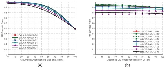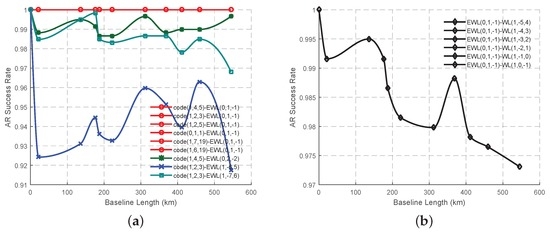 The variation trend of AR success rate in GF TCAR. (a) The signal pairs with combined code and EWL carrier phase; (b) The signal pairs with ambiguity corrected EWL carrier phase signal and WL carrier phase signal.