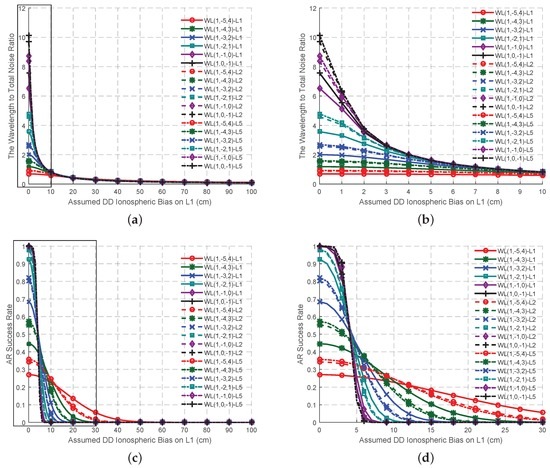 Besides working with EWL ambiguity corrected signals and combined code signals, for WL signals, another considerable aspect is to work with the fundamental signals, whose ambiguities are of the interest when high precise positioning is needed. Table 4 shows the ISFs and the measurement noise of the WL signals working with the fundamental signals, while the wavelength to total noise ratio and the AR success rate are shown in Figure 5a,c and partly amplified in Figure 5b,d updating with the DD ionospheric bias on L1. When the affect level of the DD ionospheric bias is less than approximate 2 cm, the signal pairs, WL(1, −1, 0) and WL(1, 0, −1), are clearly at a priori stage to be adopted as the optimal, on account of the high wavelength to total noise ratio and AR success rate. However it is not easy to decide the ambiguity of which fundamental signal should be solved first as both the wavelength to total noise ratio and the success rate are similar for a certain WL signal. When the effect of the DD ionospheric bias increases, both the wavelength to total noise ratio and the AR success rates of all the signal pairs decline significantly into a value near zero, making it difficult to decide the optimal signal pair for AR. The bad AR performances of WL-single signal pairs might be because of the high ISFs of these signal pairs, as well as the incorrect assumptions problem, which will be tested in the next section in order to select the optimal WL phase signal and the corresponding signal pair. Here we also find that there is a strong correlation (0.9337), between the wavelength to total noise ratio and AR success rate. In order to obtain a 100% success rate, the approximate wavelength to total noise ratio should be larger than 8.