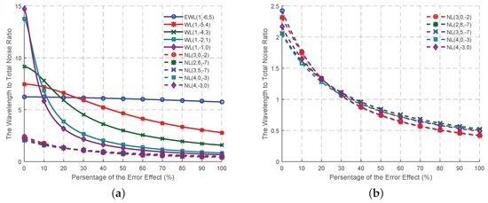 The variation trend of the wavelength to total noise ratio of the selected combined signals in Table 5 updates with the effect percentage of the total noise level from 0 to 100. (a) The EWL, WL and NL combined signals; (b) The NL combined signals only.