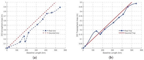 The variation trend of DD ionospheric bias and DD tropospheric bias updates with the baseline length. (a) The ionospheric bias; (b) The tropospheric bias.