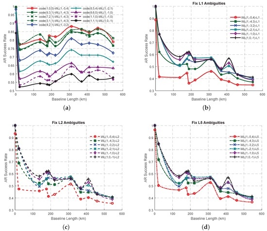The variation trend of AR success rate in GF TCAR. (a) The signal pair with combined code and WL carrier phase; (b–d) The signal pairs with ambiguity corrected WL carrier phase signal and fundamental signals L1, L2 and L5 respectively.