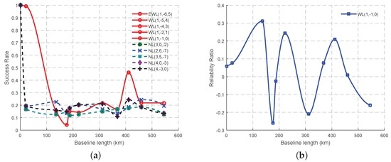 The AR success rate of the eleven baselines are initially calculated to prepare the data which is used to demonstrate the changes with the increase of the baseline length using the PCHIP interpolation method. Figure 11a shows that the EWL and WL signals share the same AR success rate along the increase of the baseline length. Thus the reliability ratio is considered among all the five EWL and WL signals, with a result of the selection of the second optimal EWL and WL signal, WL(1, −1, 0), as shown in Figure 11b. Although, Figure 11b shows a randomness of the reliability ratio, it can be argued that WL(1, −1, 0) can provide more reliable ambiguities than EWL(1, −6, 5) especially in the case that the baseline length is within 100 km from the statistical point of view. Compared to the success rates of the EWL and WL signals, the NL signals will not have a better performance when the baseline length is within 100 km. For the baselines whose lengths are longer than 100 km, it is hard to say which signal possesses the best performance, as all the curves show obvious random volatility. However, among all the NL signals, the traditional NL(4, 0, −3) has the best performance when the baseline length is between 200 and 400 km, as well as NL(4, −3, 0), while NL(2, 6, −7) can be the most outstanding NL signal for the baseline length around 100 km, with a maximum larger value of 8%.