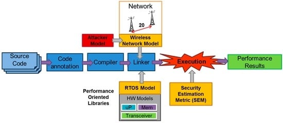 The simulation methodology used in this work is based on the native simulation approach [53] depicted in Figure 3. The simulator presented in [53,54] (SCoPE) extends SystemC capabilities to perform HW/SW co-simulation. SCoPE is used as a starting point of this work that extends this simulator with new capabilities such as WSN and attack simulation. The simulator supports platform modeling for behavioral simulation and performance estimation of embedded systems. The native-simulation based frameworks model all hardware elements related with software execution (e.g., processors, memories and buses) and RTOS with a set of tables that define the execution time and power consumption per instruction and RTOS function [52]. This approach combines the execution of the annotated software code in a host platform with the use of a virtual platform model of the hardware architecture and embedded RTOS. With this simulation technique, it is possible to model hardware platform components in System-C and execute the software code of each node on the same platform. D. Calvo et al. [54] present several high-level component models (e.g., processors) and how the power estimation is implemented. In Section 4.2, this work defines new models that are essential components of a wireless sensor node. Thus, it is possible to obtain fast and accurate estimations of power consumption, execution time, data/instruction cache hits and misses, number of bus accesses, network traffic, etc. The co-simulation process includes several steps: