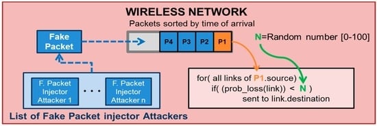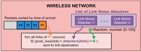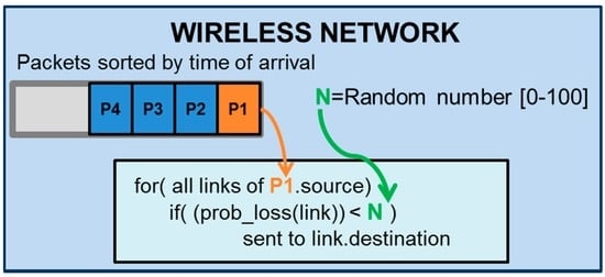 It is important to clarify that the network model is responsible for transmitting the packets to their destinations. When a node sends a packet, the network adds the packet to the transmission queue that is sorted be the time of arrival at the reception node. When the simulation time matches the time of arrival of the packet, the wireless network pops the packet and generates a real random number between 0 and 100. If the packet-loss probability (“prob_loss (link)” in Figure 5) is lower than this random number, the network model transmits the packet to the destination node; otherwise, the packet is discarded. Figure 5 represents a scheme of this wireless network operation.