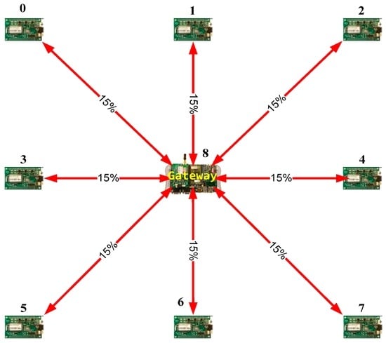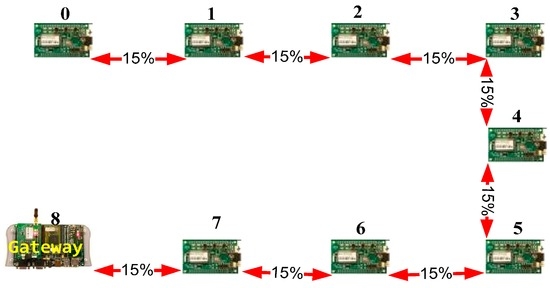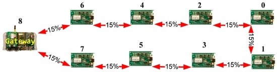 For example, a 100% packet-loss probability means that the sending-node range is not enough to directly reach the destination node, thus all the transmitted packets are lost. If the link has a 0% packet-loss probability, all the packets reach their destinations. If the link from node 0 to node 1 has a probability of 10% (Figure 4), this indicates that, on average, 90 packets will reach node 1 for each 100 packets transmitted by node 0.