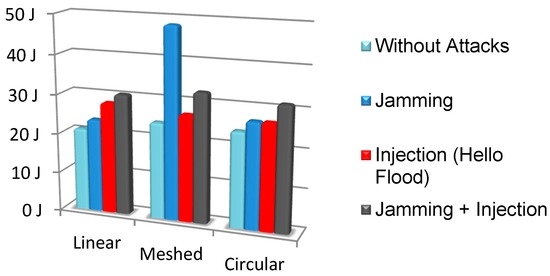Table 7 shows the different real power consumptions of the network for different conditions. The time slot was 2 min. It can be observed that in the case of an attack, the power consumption increases 132% compared to the attack-aware firmware. Moreover, the consumption of the two nodes in a normal operation (without attacks) is similar. This proves that the countermeasures developed do not increase the consumption in normal operation.