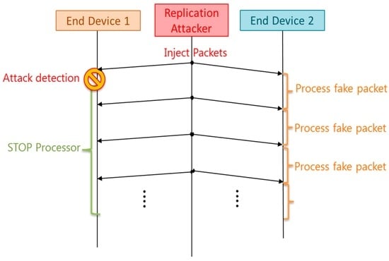Once the attack is detected, a countermeasure has to be implemented. Different attack-aware methods were introduced and compared in the simulation. It was observed that the most effective response against the attack was to sleep the node once the receiving packet rate was higher than the defined threshold rate. This sleep mode was configured to wait for a specific amount of time (30 s). After that, it awakes and continues searching for the replication attack. The idea is to avoid the draining of the battery with this firmware response. A scheme of this countermeasure is shown in Figure 13, where it can be appreciated that the end device 1 detects the attack and stops its processor. However, the end device 2 does not have countermeasures and it processes all the fake packets injected by the attacker, thus increasing its power consumption.