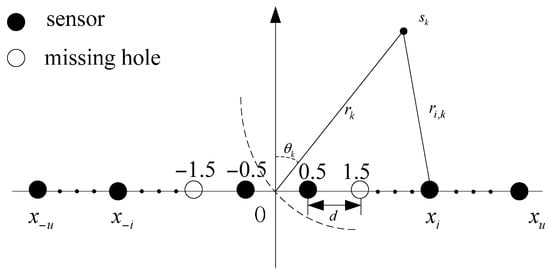 Consider a near-field scenario in which narrowband sources impinge on a symmetric linear array with sensors showing Figure 1 (The number of sensor is assumed to be even here, however, our method also works in odd case). The sensors are assumed to be located at the underlying grid of a minimum spacing . Let be the positions vector of array sensors. The signal received by the sensor can be expressed as Equation (1)