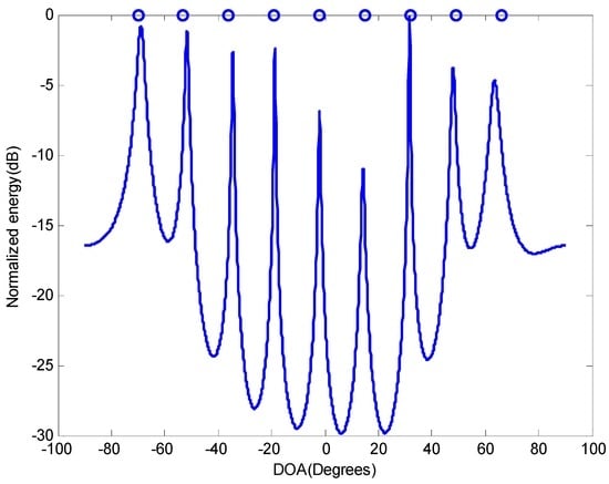 First, consider the scenario in which a CSNA with 8 sensors receives 9 narrowband sources radiated from . According to Section 3, the DOF of our method based on a CSNA with 8 sensors is increased to 12, thus can estimate DOAs of 11 sources. Figure 3 plots the spatial spectrum of the proposed method based on the CSNA shown in Figure 2 with and . It can be seen that the proposed method can resolve the 9 signals clearly with 8 sensors.